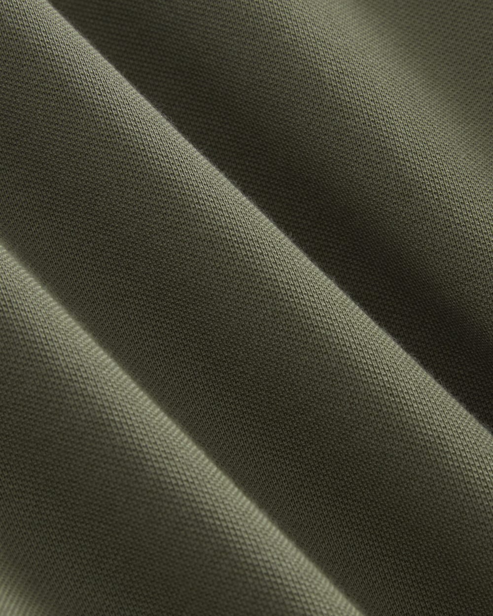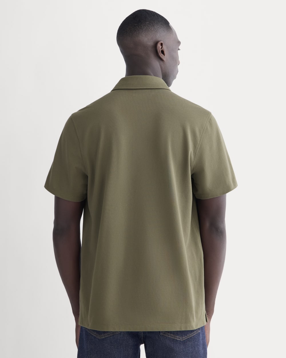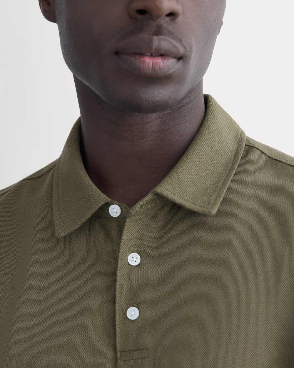 This piece features a polo collar, button placket, slim fit, short sleeves, in a new regenerative cotton and recycled polyester performance fabric that’s moisture-wicking, quick drying, and breathable, with a little stretch.