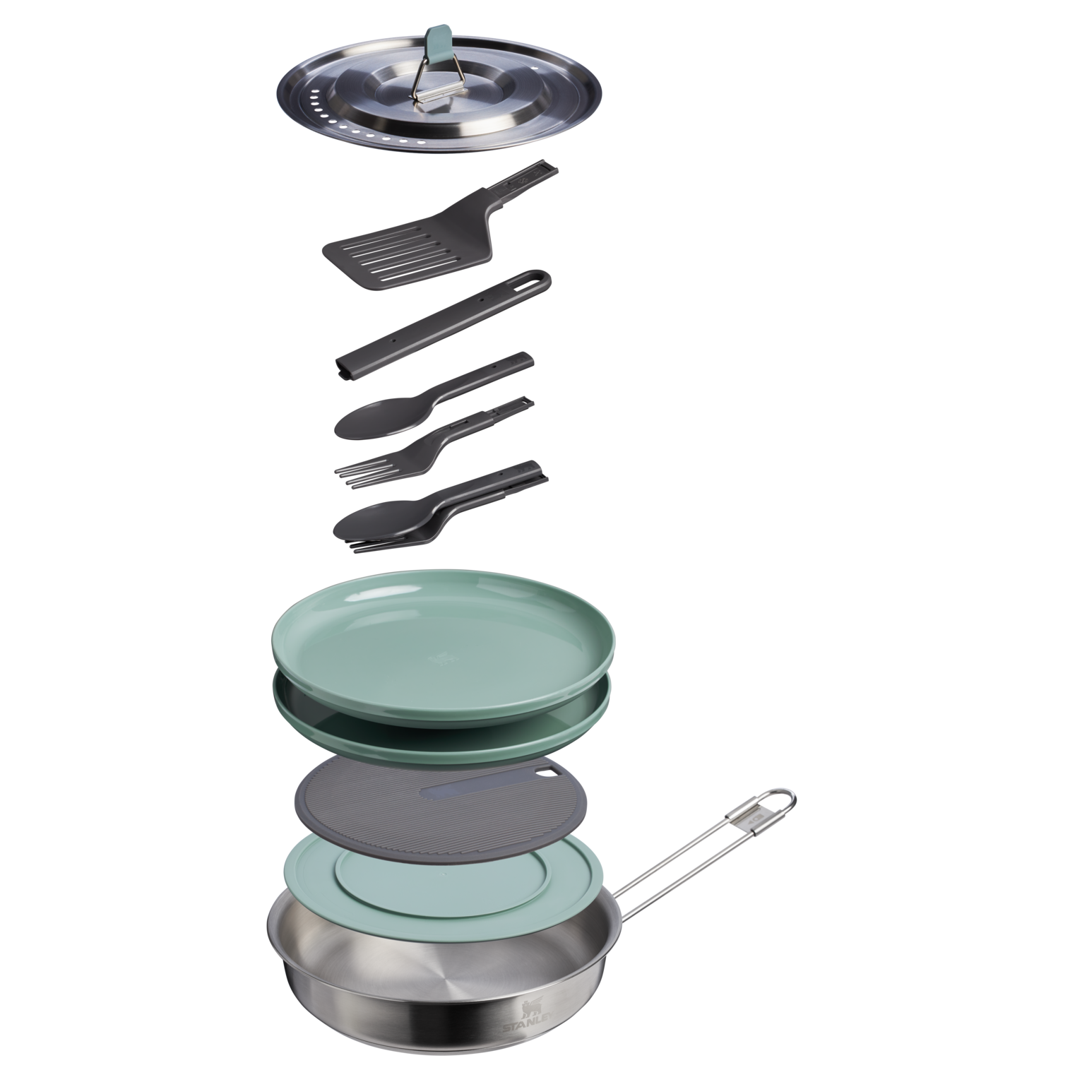Simple and efficient, the 12-piece Wildfare Core Fry Pan Cookset nests together for packing ease. The tri-ply bonded stainless steel pan evenly distributes heat, and the lid has vent and strain holes. The 2-piece spatula and 2-spork set go from compact to full sized. A nonslip cutting board offers space to prep meat and vegetables, while a removable silicone trivet protects surfaces from hot pans. Colorful plates complete the set for outdoor hosting with the comfort of home.