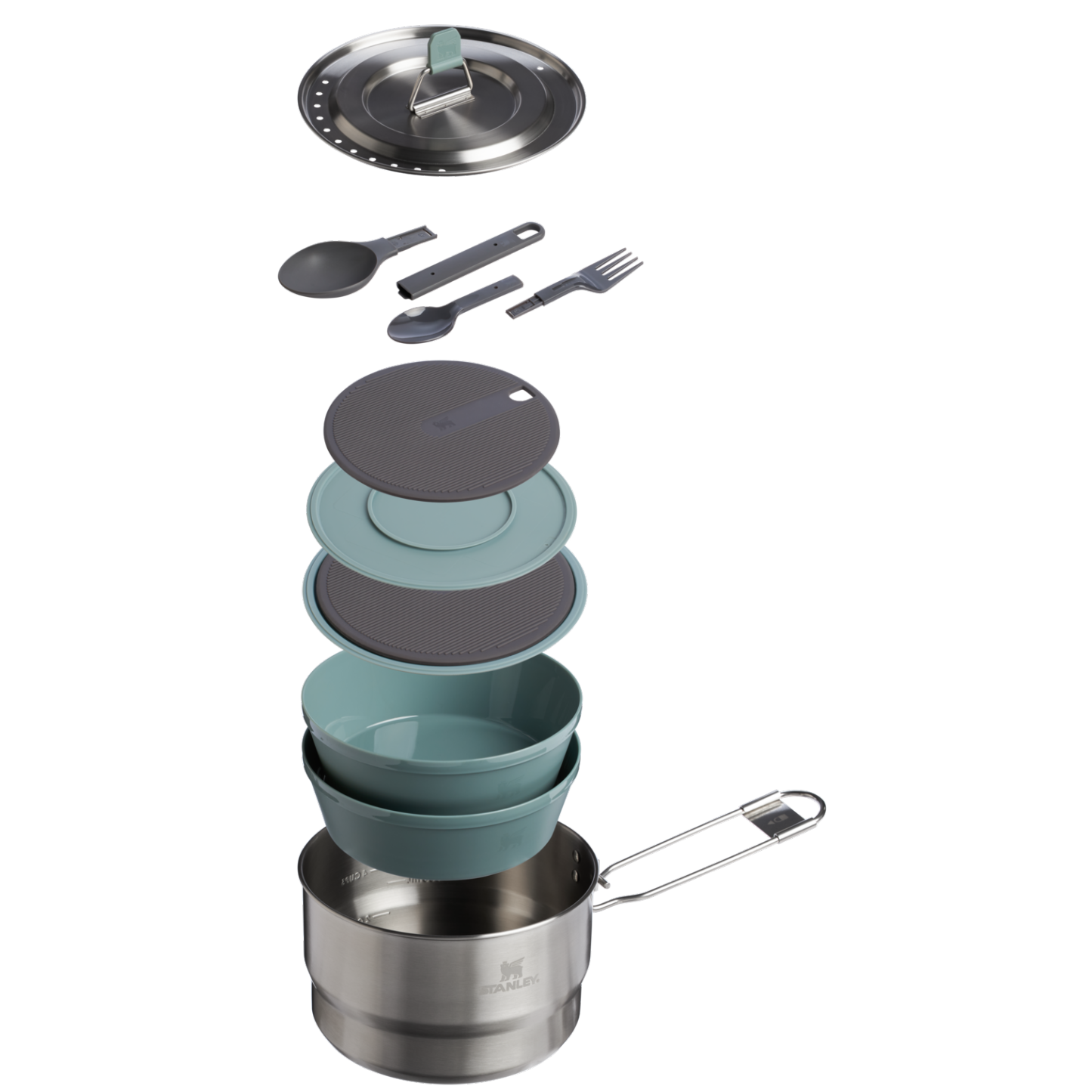 The 14-piece Wildfare Go Two Bowl Prep & Cook Set nests neatly together for efficiency. Open the 1.65-quart stainless steel saucepan to find two 16-ounce bowls inside. The included two-piece spatula and pair of dual-sided sporks go easily from compact to full sized. Nonslip cutting boards include removable silicone trivets. All the luxury of cooking at home, in the wild.