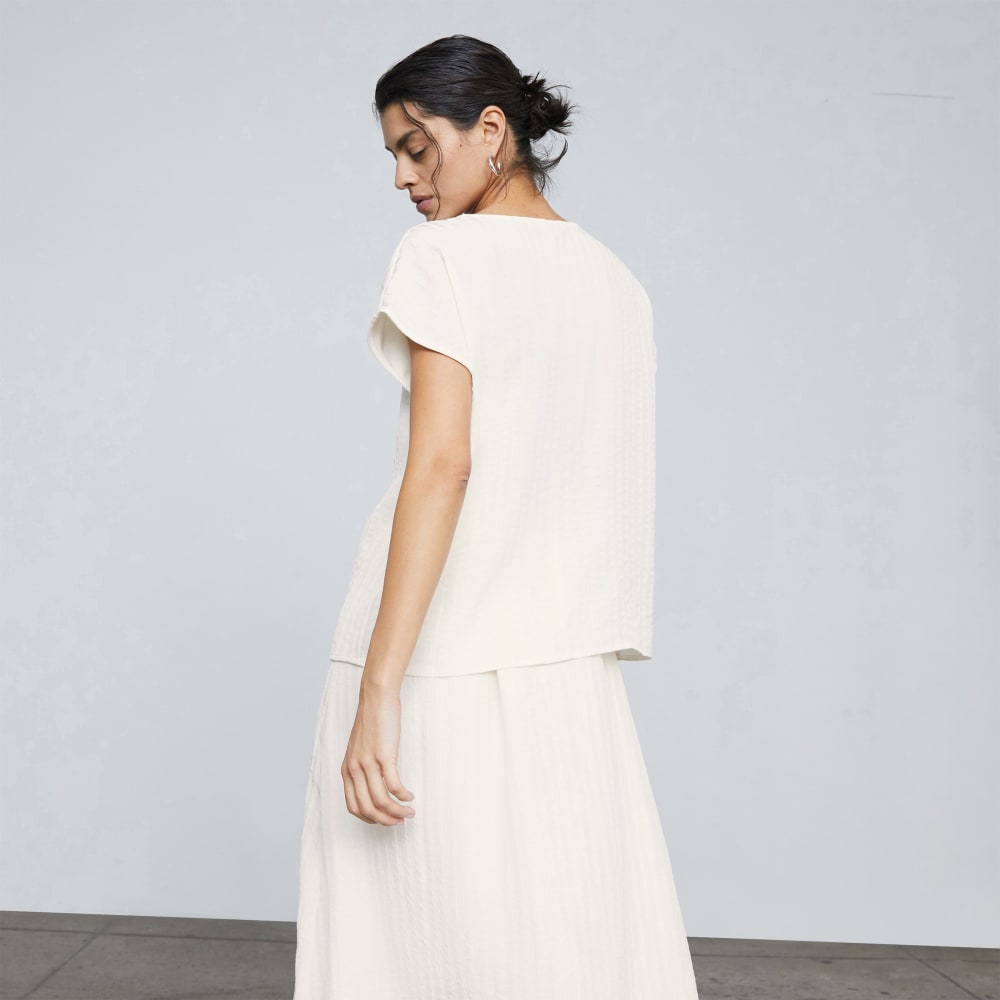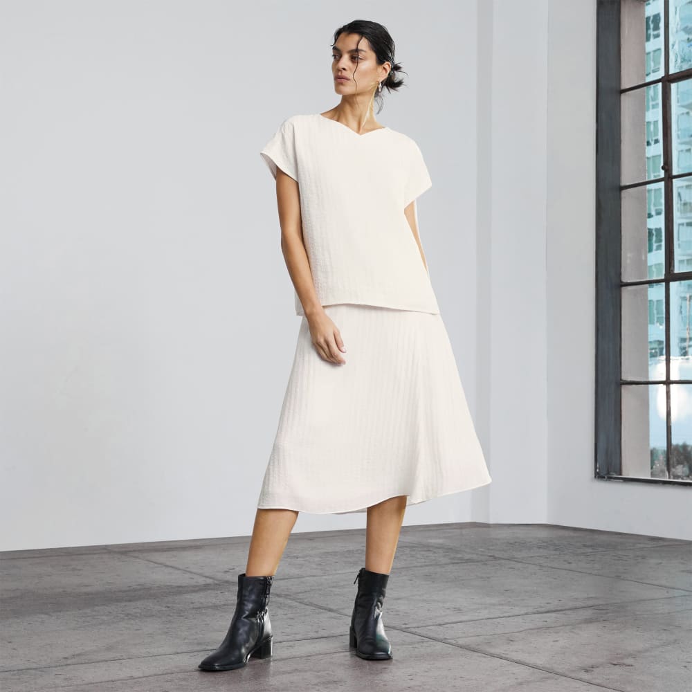 Featuring a high V-neck and cap sleeves in our new, softer, textured stripe viscose fabric. This classic style will get heavy closet rotation. This fabric has a heavier weight and is great for transitioning seasons. The viscose in this garment comes from an FSC-certified supplier who has been audited and assessed as being at low risk, or has taken substantive action to eliminate known risk of sourcing rayon and viscose from ancient and endangered forests by CanopyStyle. Made from post-consumer plastic bottles that are collected, washed, chopped, melted, and then made into polyester yarn, REPREVE® recycled polyester boasts less energy and water usage as well as reduced greenhouse gas emissions, when compared to virgin polyester and other conventional recycled plastic sources. The REPREVE® registration platform provides full supply chain visibility from source to product—ensuring the exact bottle count per product and source location of those bottles. To date, REPREVE® has saved over 30 billion plastic bottles from landfill.