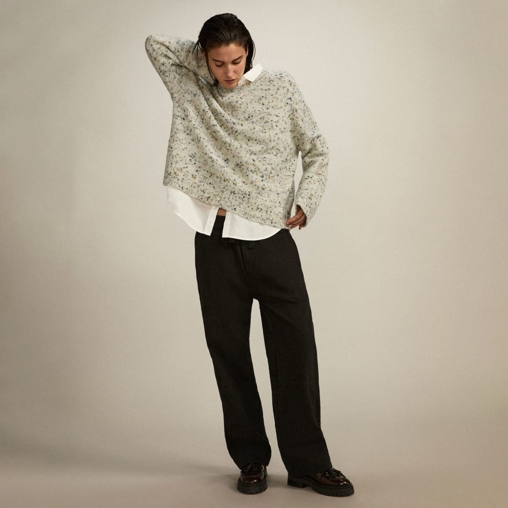 Big on fun, soft to touch, the Confetti Crew celebrates playful style with a sprinkle of colors. Made with a sumptuous merino wool blend in an airy boucle texture, this cozy staple features an oversized silhouette with wide sleeves and ribbed hems. Pair with our Way-High Drape Pant for a relaxed, yet polished, look.