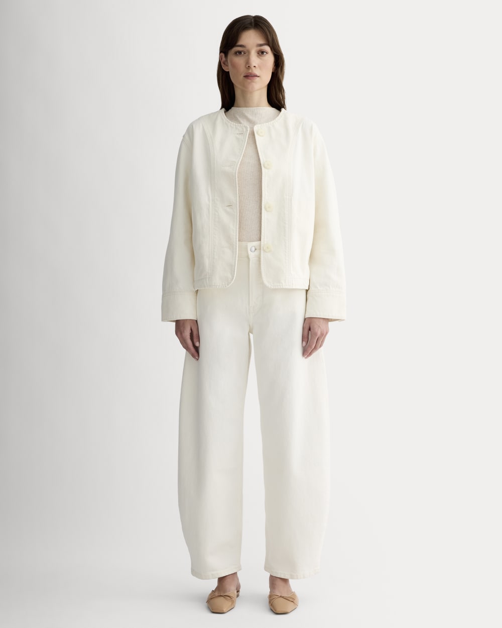 This piece features a relaxed fit, a button-front closure, barrel silhouette in non-stretch denim.