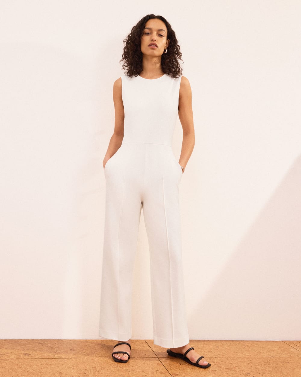 This piece features an inset circular heel, a sharp modern square toe, narrow half-rounded bands for a barely there look and feel, leather sourced from and LWG Gold-certified tannery, recycled leather outsole, and an elastic instep strap that comfortably stretches with your foot.