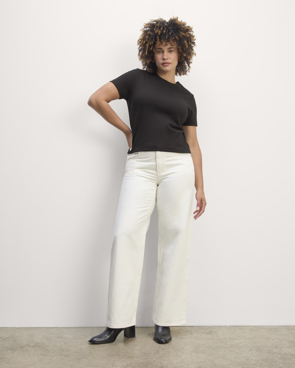 This piece features a slim fit, short sleeves, crew neckline, and back zipper at neck in our soft, double-knit Dream fabric with a hint of stretch.