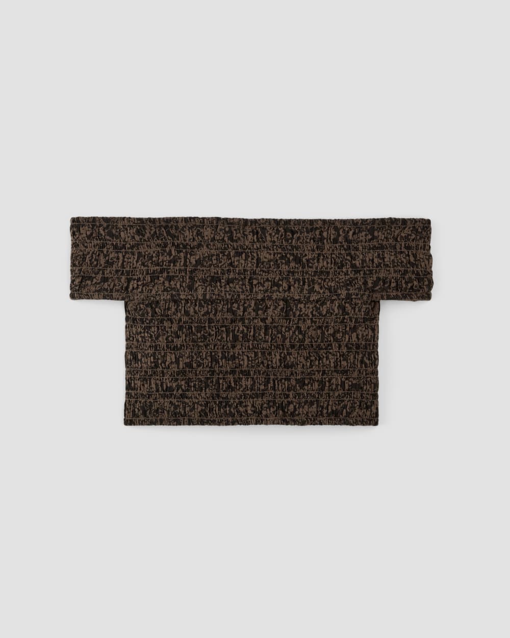 This piece features a smocked bodice, off-shoulder silhouette, cropped length, and full lining.