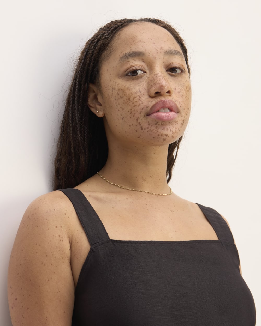 This piece features a relaxed fit, cropped straight leg, square neckline, elasticized back, side button detail with self covered buttons, a clean front, and made from 100% European Flax™ Linen.