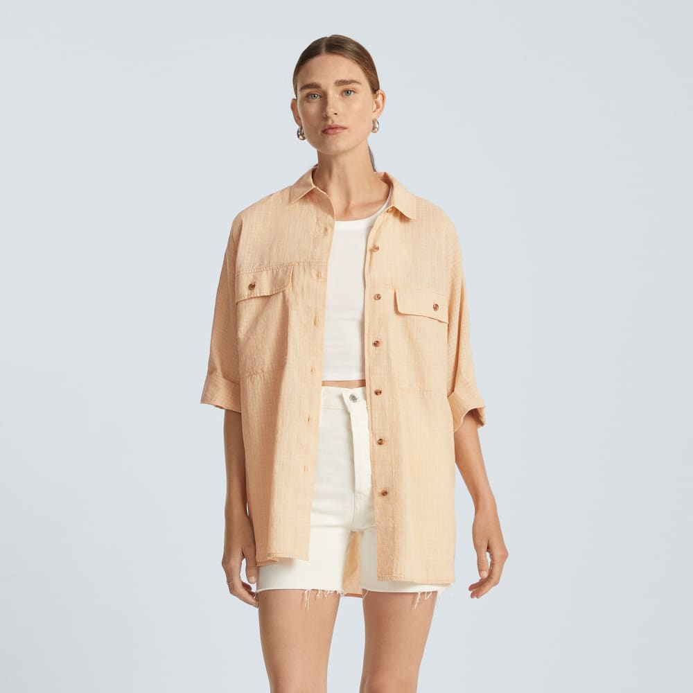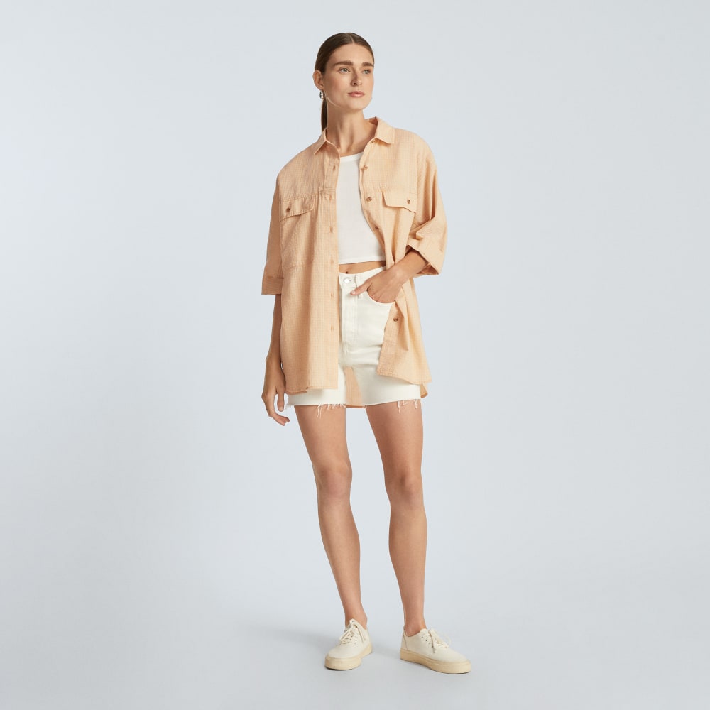 The Cotton Tourist Shirt is made of a cotton voile fabrication that’s soft, slightly sheer, and eye-catching thanks to its two-tone, plaid pattern weave and kimono sleeves. An easy, button-down shirt with a high-low hem designed for layering, so roll up the sleeves and tie it at the front for a loose, casual look that’s travel-ready.