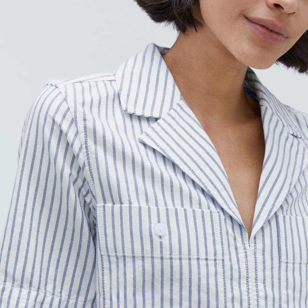 In a cropped, boxy popover fit, The Oxford Popover. features wide lapels and a v-neckline, with two utility style front pockets. Wide short sleeves balance the midriff-skimming hem. Made with our much-loved 100% organic cotton Oxford fabric, it’s perfect to pair with high-waist pants and denim.