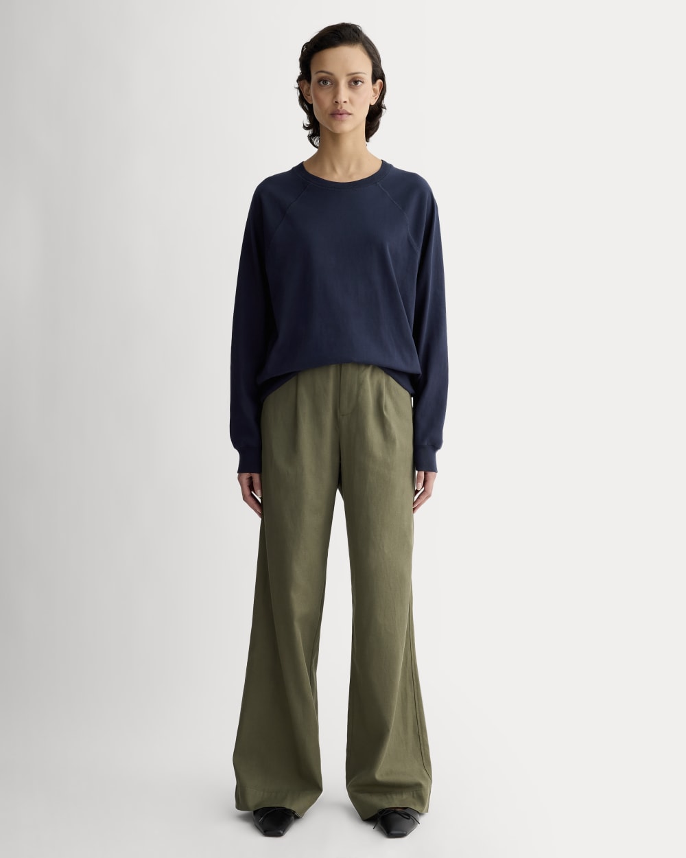 This piece features a relaxed fit, crew neckline, long, raglan sleeves, in premium weight 100% organic cotton jersey.