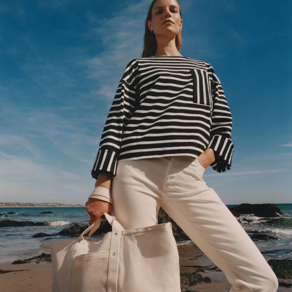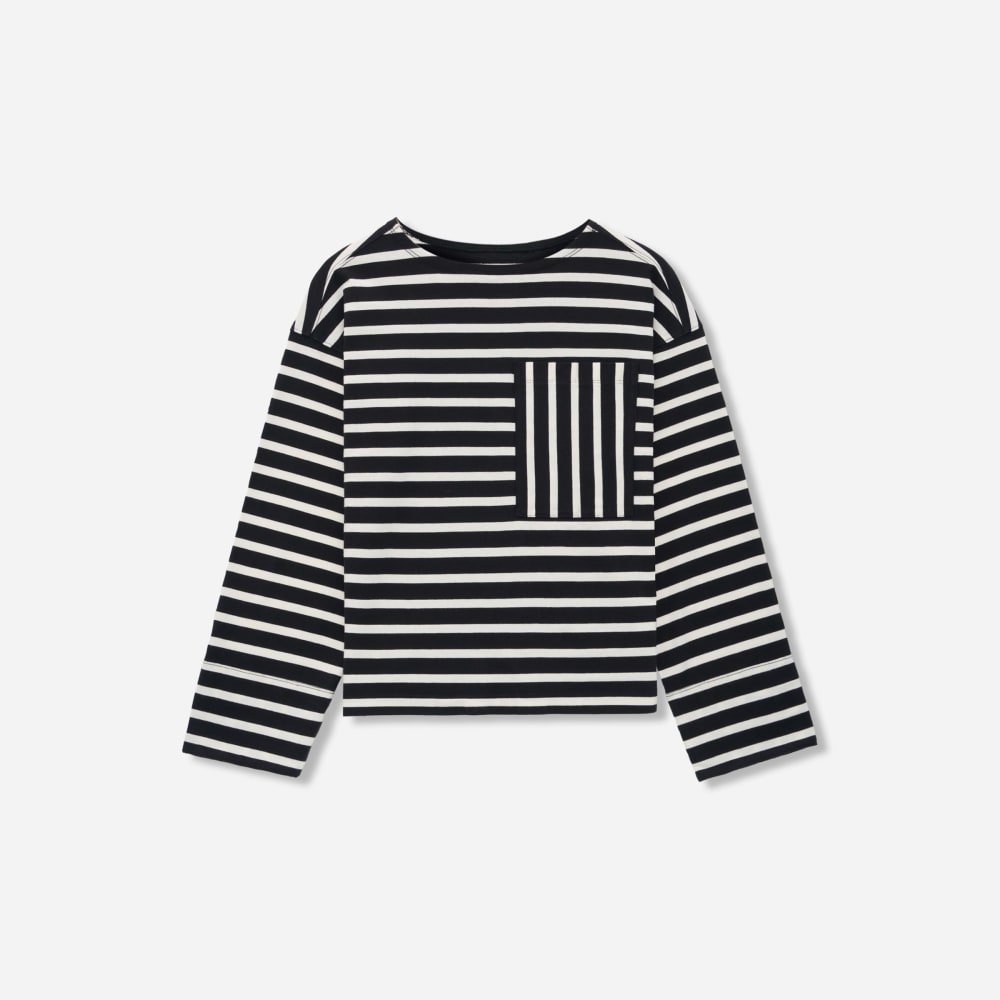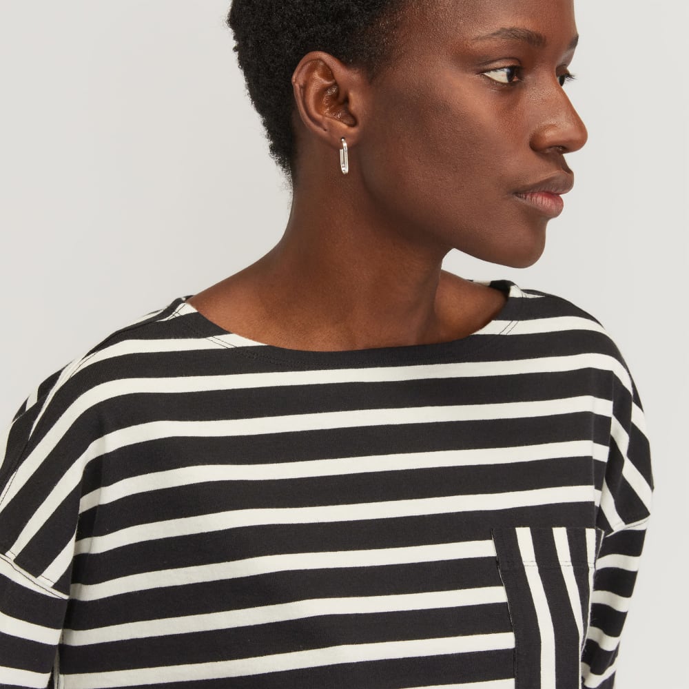 The Premium Weight Oversized Pocket Tee is a new take on a classic mariner stripe tee. Featuring a boatneck, cropped boxy body, long, wide sleeves, and an oversized chest pocket—perfect for holding your favorite sunglasses. Fold up the sleeves for a contrasting stripe effect. This cropped shirt is the quintessential layer for balmy, Summer evenings. Organic cotton uses crop rotation, cover crops, and organic fertilizers instead of toxic chemical fertilizers or pesticides—which means cleaner water, lower water usage, lower pesticide use, healthier soil, and a safer working environment for cotton farmers, compared to conventional cotton.