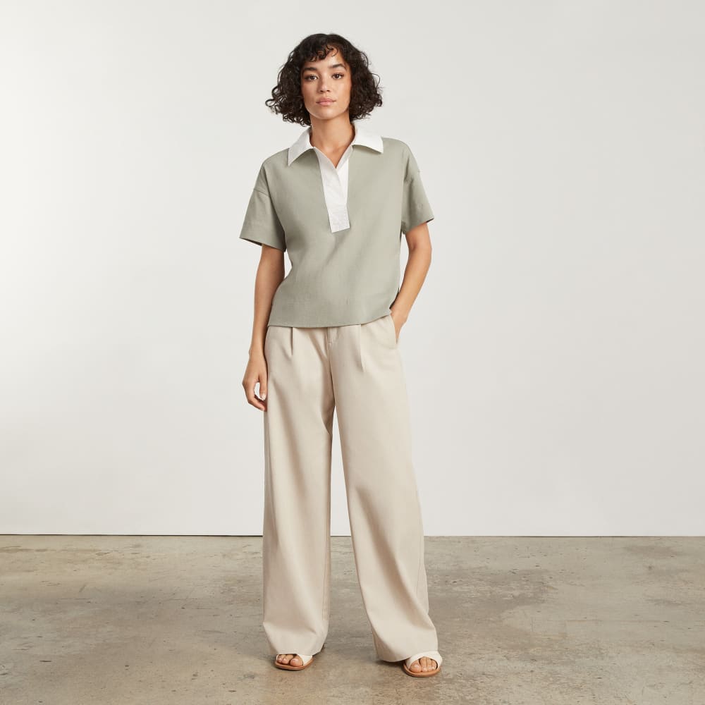 Reminiscent of ’70s summer camp threads, the Retro Jersey Polo features a buttonless collar, a relaxed dropped shoulder, a woven placket, loose short sleeves, and an oversized, boxy shape. Plus, it’s made of 100% organic jersey that’s light, breathable, and perfect for warm-weather days.