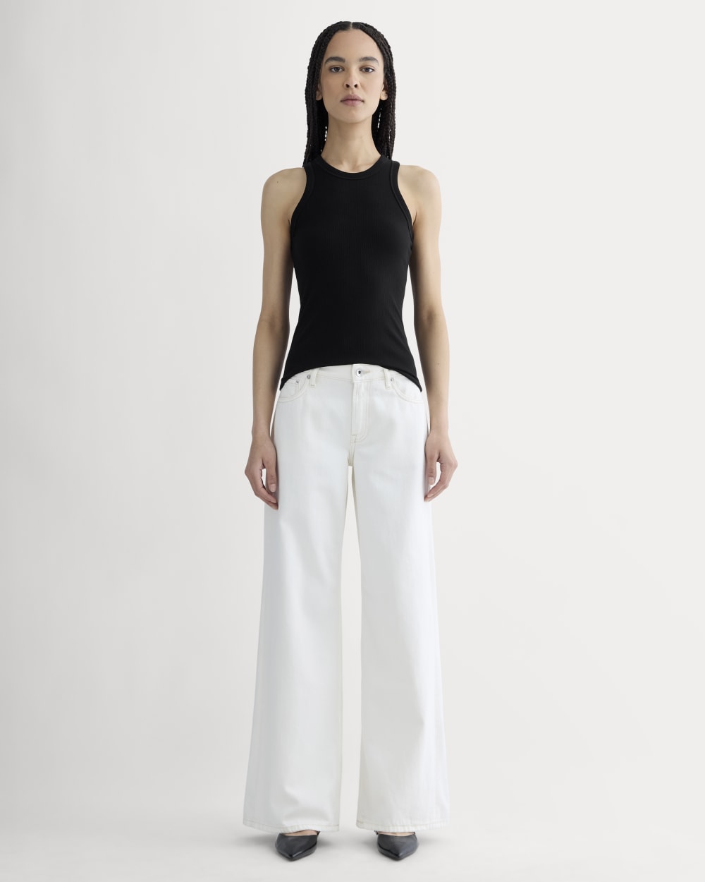 The perfect balance of sporty yet elevated, this tank features a crew neckline and racerback silhouette in a soft ribbed fabric with a subtle sheen. Channel '90s minimalism with tailored black pants and barely-there sandals.