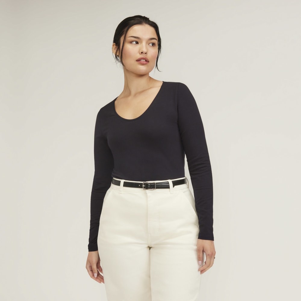 Made from a blend of stretchy jersey fabric and our Supima® cotton, this long-sleeve essential features a delicate, ballet inspired scoop neck for an elevated and sophisticated look. Grown in the United States, Supima® cotton is distinguished by its extra-long fiber length, which gives it more durability and a softer hand feel. Supima® is able to authenticate the source of its cotton across the entire supply chain, from the fiber and yarn to the fabric and finished product.