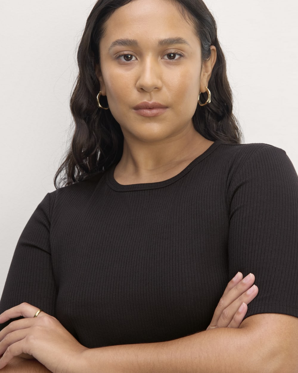 This piece features a crew neck, cropped silhouette, short sleeves, in our ribbed Shimmy fabric that offers an elevated softness and subtle sheen.