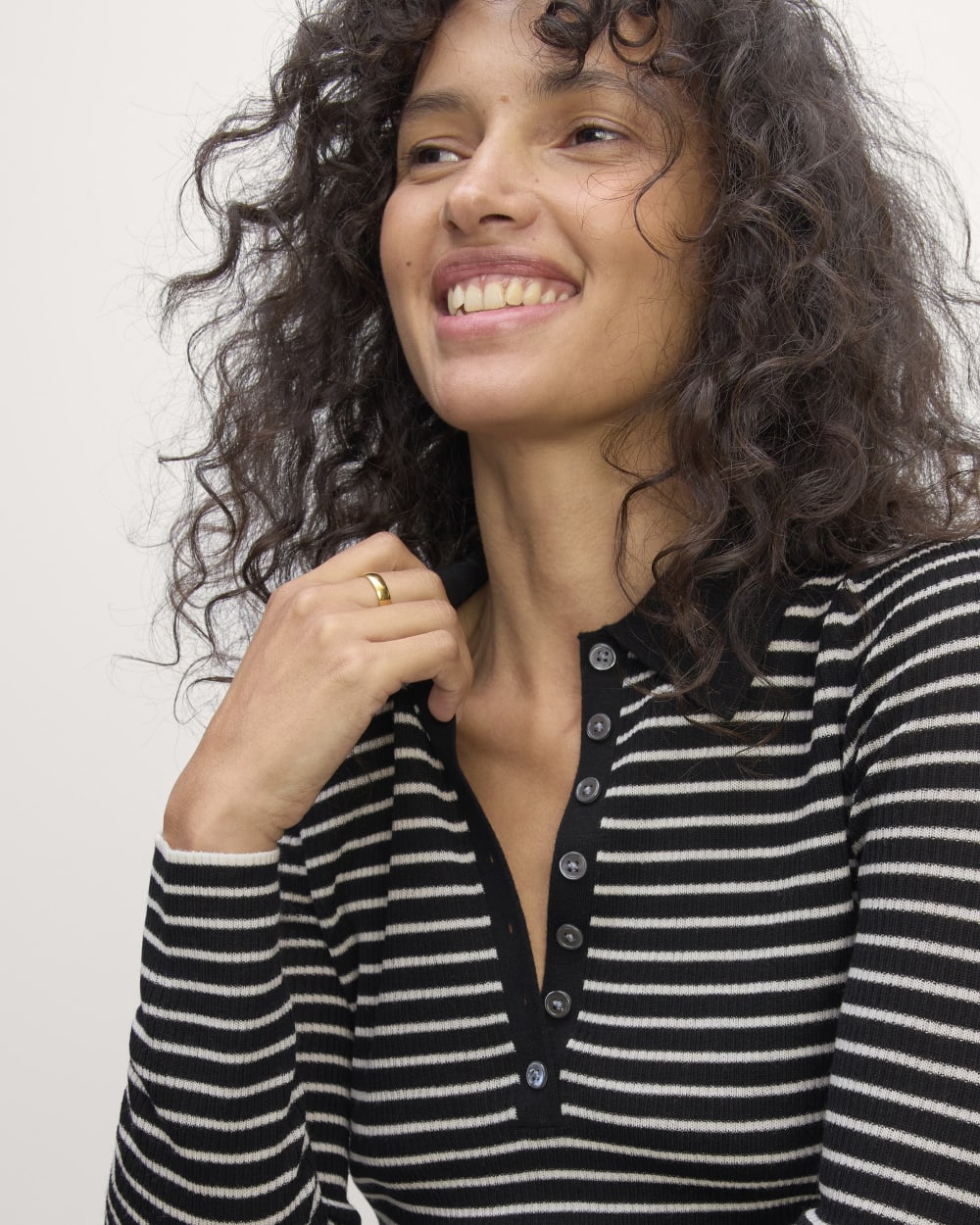With a form-fitting silhouette, and ultra-soft fabric, it features a ribbed polo, a fallback shoulder, and jersey detailing in the underarm.